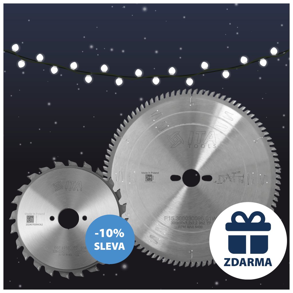 Přinášíme vánoční akci pro všechny výrobce nábytku a truhlářské provozy. Ke každému diamantovému skládanému předřezu ITA DSC DIA nyní získáte 10% slevu a zároveň pilový kotouč ITA P15 (D300/F30/Z96) zdarma pro vaše formátovací pily.